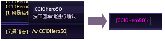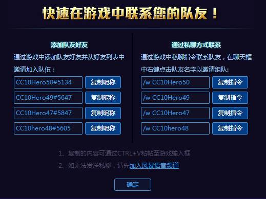 l點擊私聊方式的“復(fù)制指令”按鈕,復(fù)制指令后粘貼(CTRL+V)至游戲聊天輸入框中并回車,即可與對應(yīng)隊員私聊;
