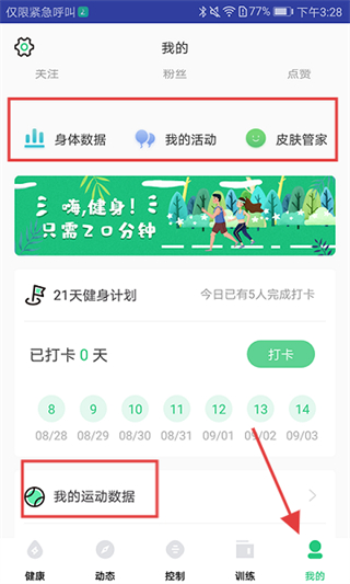 5、管理身體數(shù)據(jù)、活動記錄,參與21天健身計劃打卡,查看個人運動數(shù)據(jù)。