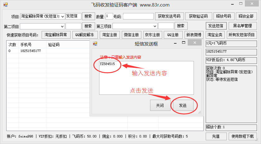 點(diǎn)擊獲取的手機(jī)號(hào)碼,再點(diǎn)擊送短信,如圖所示: