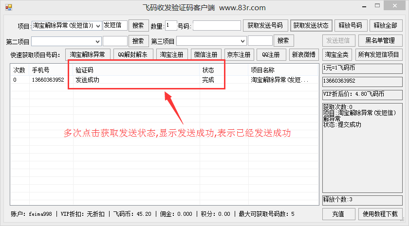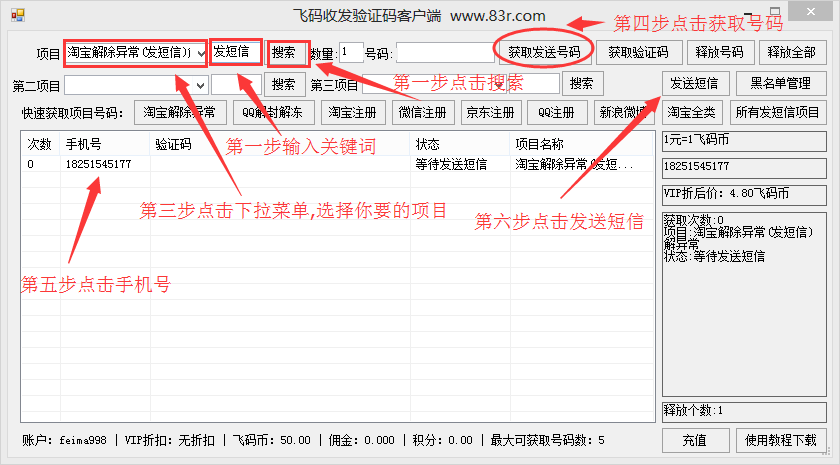 飛碼收發(fā)驗(yàn)證碼是一款支持多線程API操作可指定多個(gè)號(hào)碼收發(fā)短信的電腦上收發(fā)手機(jī)短信驗(yàn)證碼的短信收發(fā)平臺(tái),例如:手機(jī)1,手機(jī)2,手機(jī)3,代表獲取這三個(gè)指定的號(hào)碼(必須是本站的號(hào)碼才可以)客戶端全自動(dòng)接收和自動(dòng)接收返回發(fā)送短信狀態(tài)內(nèi)帶使用教程卡商可直接登陸客戶端。并且飛碼收發(fā)驗(yàn)證碼客戶端可收發(fā)短信解除異常支持所有網(wǎng)站收發(fā)送短信 淘寶 解封,qq解異常,陌陌驗(yàn)證,注冊(cè)小號(hào)等業(yè)務(wù)。趕快下載體驗(yàn)吧?。?!