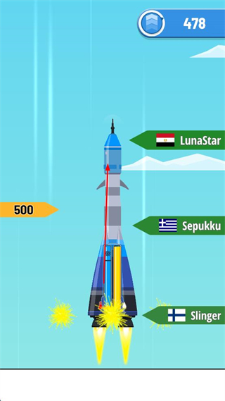 點擊屏幕啟動火箭,這樣火箭就能飛到太空并走得更遠。按住屏幕并盡可能地發(fā)射火箭,