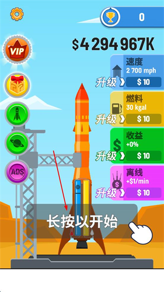1、在游戲主界面,長按對應區(qū)域啟動火箭,讓火箭進入飛行狀態(tài)。