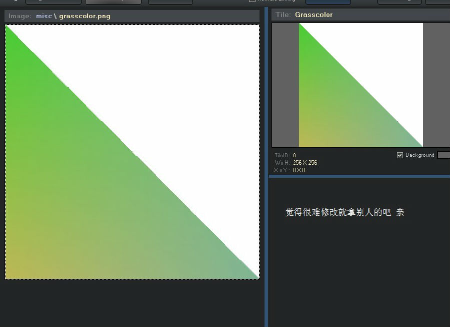grasscolor.png 顧名思義,對(duì)應(yīng)的草地的顏色變化,這里說(shuō)明一點(diǎn),terrain.png 中草地和蕨類還有草都是根據(jù)這個(gè)來(lái)變化的,但是帶草的泥土就不是。