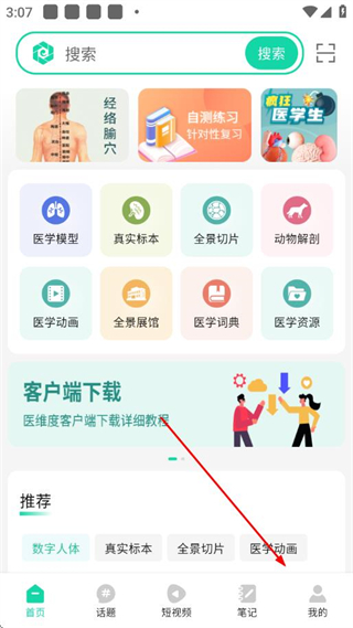 1、打開醫(yī)維度解剖app,進(jìn)入首頁,點(diǎn)擊底部導(dǎo)航欄中的我的選項。