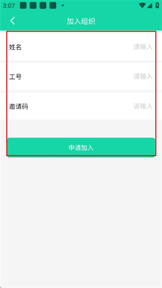 3、在加入組織頁面填寫姓名、工號、邀請碼后,點(diǎn)擊申請加入按鈕提交申請。