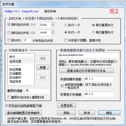 或打開(kāi)【選項(xiàng)設(shè)置】窗口設(shè)置定時(shí)關(guān)機(jī)、快速隱藏窗口等功能(圖2所示)。左鍵單擊圖標(biāo)則會(huì)打開(kāi)瀏覽器主頁(yè),根據(jù)前期用戶的反饋,相信您很快會(huì)習(xí)慣并喜歡這種新的打開(kāi)主頁(yè)的方式。