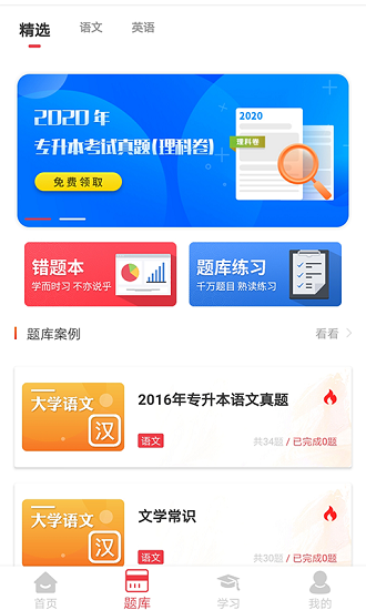 專升本大學(xué)語文、高等數(shù)學(xué)、英語歷年專升本真題卷、模擬卷、專項知識點訓(xùn)練、模塊訓(xùn)練、考前刷題包……應(yīng)有盡有,滿足各個階段學(xué)員的刷題需求。