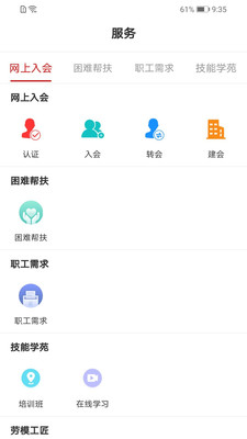 -平臺(tái)為大家提供網(wǎng)上入會(huì),困難幫扶,職工需求以及技能學(xué)苑等。