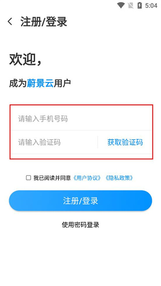 3、在注冊/登錄界面輸入手機號碼,點擊獲取驗證碼并填入收到的對應(yīng)驗證碼。