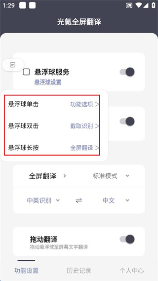 4、在懸浮球功能設(shè)置界面,可設(shè)置懸浮球單擊、雙擊、長(zhǎng)按的功能,完成懸浮球功能配置。