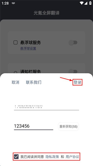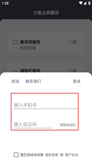 2、在登錄界面,輸入手機(jī)號(hào)和驗(yàn)證碼,勾選同意隱私政策和用戶協(xié)議,點(diǎn)擊“登錄”按鈕。