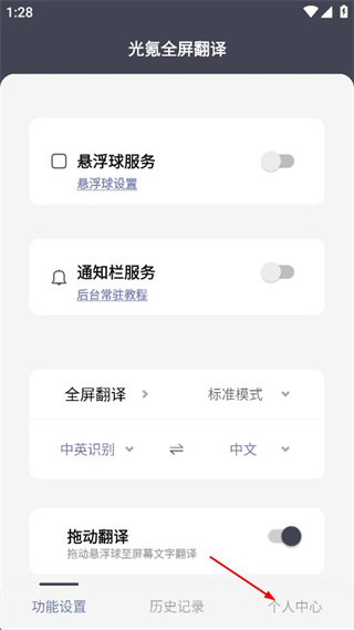 1、打開(kāi)光氪全屏翻譯軟件,點(diǎn)擊底部“個(gè)人中心”圖標(biāo),彈出登錄界面。