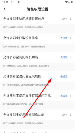 4、在隱私權限設置頁面,可選擇對應權限,點擊右側的去設置按鈕,即可跳轉頁面調(diào)整權限。