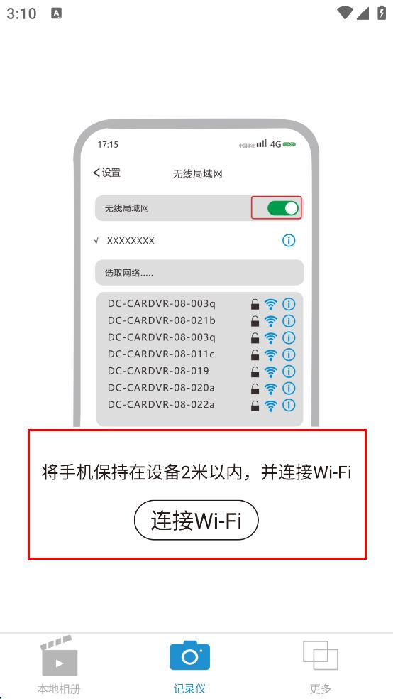 2、點(diǎn)擊“連接記錄儀”按鈕,進(jìn)入連接準(zhǔn)備界面,按照提示,將手機(jī)保持在設(shè)備2米以內(nèi),然后找到“連接Wi-Fi”按鈕并點(diǎn)擊。