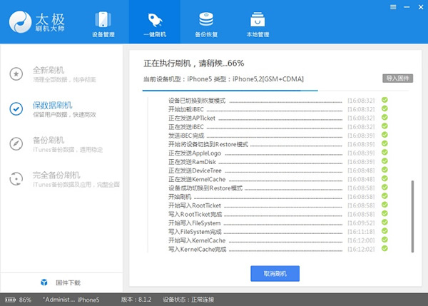 太極刷機(jī)大師是一款綜合刷機(jī)、越獄、手機(jī)管理等多種功能的PC端管理軟件,由太極越獄團(tuán)隊(duì)開發(fā),支持自動(dòng)匹配固件,一鍵刷機(jī),一鍵越獄等功能 ,同時(shí)包含多種刷機(jī)模式和多種備份模式。太極刷機(jī)大師提供了四種刷機(jī)模式,普通刷機(jī)模式、保留數(shù)據(jù)刷機(jī)模式、itunes備份刷機(jī)和iTunes完全備份刷機(jī)模式,四種模式各有特點(diǎn),用戶可根據(jù)自己的需求來進(jìn)行不同形式的刷機(jī),讓刷機(jī)只需一鍵!
