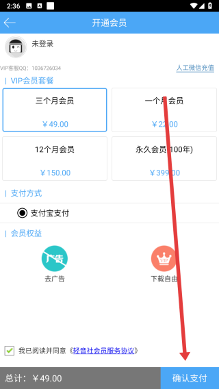 3、跳轉(zhuǎn)到開通會員頁面,點擊選擇套餐后,點擊確認支付按鈕進行開通。