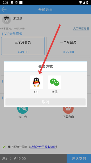 4、開通會員需先登錄,點擊選擇QQ賬號登錄后即可完成開通操作。