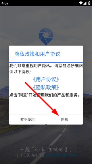 1、打開路影app,在彈出的隱私政策窗口中,點擊同意。