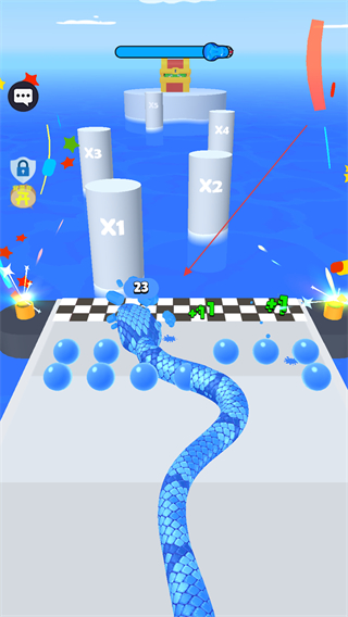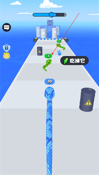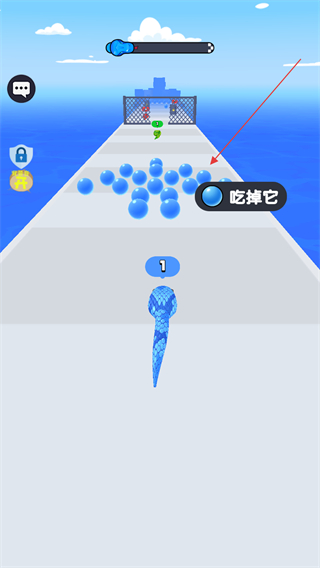 2、在跑道上收集藍(lán)色球體,不斷讓蛇頭頂?shù)臄?shù)字變大。