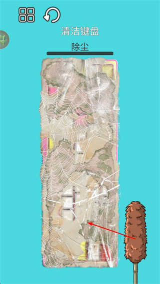 3、在清潔鍵盤關(guān)卡中,使用右側(cè)的毛刷工具,對布滿灰塵的鍵盤進行除塵操作。