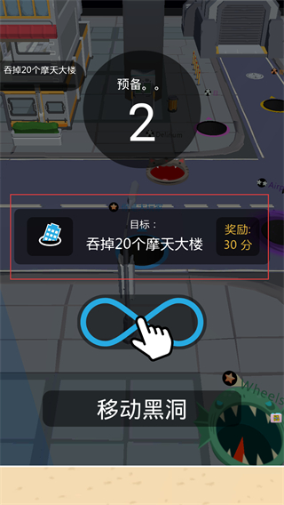 2、滑動屏幕控制黑洞移動,優(yōu)先吞噬摩天大樓等建筑,使黑洞不斷擴(kuò)大,提升能力。