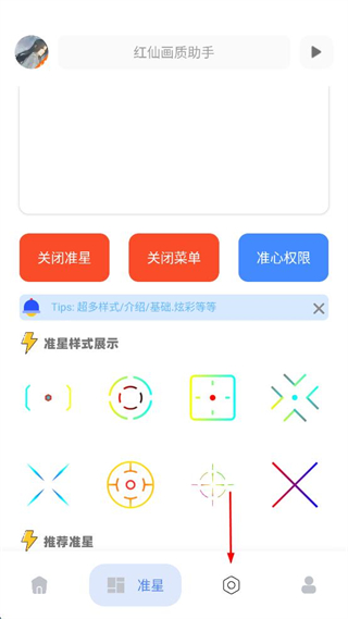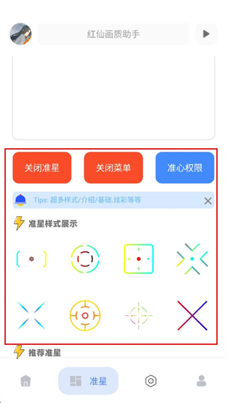 2、進(jìn)入準(zhǔn)星頁(yè)面,可看到關(guān)閉準(zhǔn)星等功能按鈕,還有多種準(zhǔn)星樣式可供選擇。