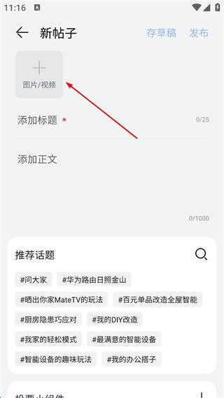 2、在新帖子頁面點(diǎn)擊圖片/視頻,添加所需圖片或視頻。