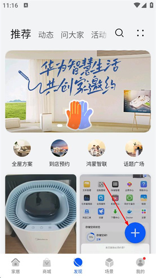 1、打開華為智慧生活應(yīng)用,進(jìn)入發(fā)現(xiàn)頁面,點(diǎn)擊藍(lán)色加號(hào)按鈕,進(jìn)入新帖子頁面。