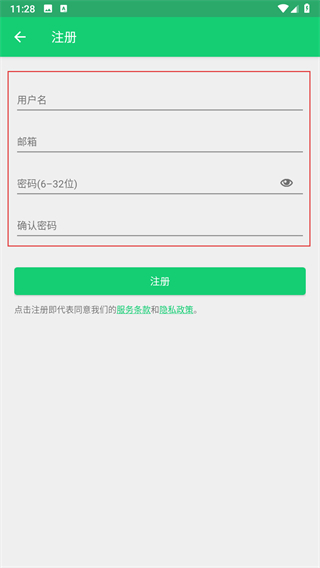 4、在注冊頁面依次填寫用戶名、郵箱、密碼及確認(rèn)密碼,完成后點(diǎn)擊注冊按鈕。