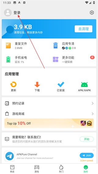 2、在我的頁面中找到登錄按鈕,點(diǎn)擊該按鈕進(jìn)入APKPure的登錄界面。
