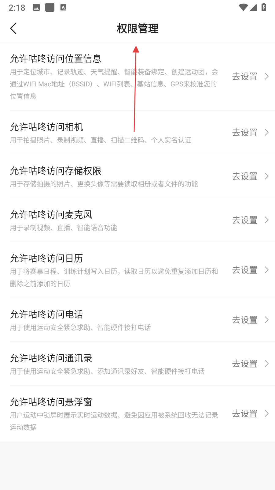 4、進(jìn)入權(quán)限管理頁面后,可對(duì)各項(xiàng)權(quán)限進(jìn)行管理,點(diǎn)擊對(duì)應(yīng)權(quán)限右側(cè)的去設(shè)置,即可跳轉(zhuǎn)至系統(tǒng)設(shè)置中調(diào)整該權(quán)限。