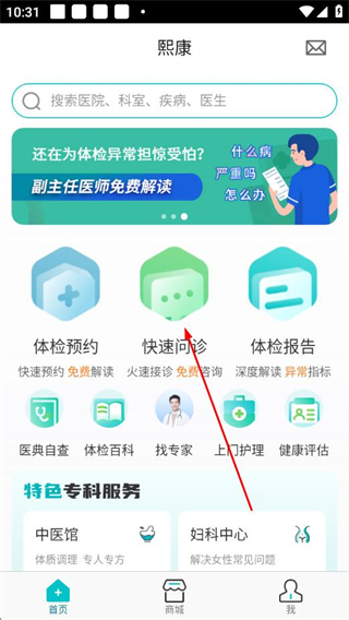 1、在體檢管家app的首頁(yè),點(diǎn)擊快速問(wèn)診選項(xiàng),進(jìn)入專(zhuān)科問(wèn)診頁(yè)面。