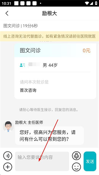3、在對(duì)話(huà)界面的輸入框中填寫(xiě)咨詢(xún)內(nèi)容,點(diǎn)擊發(fā)送即可與醫(yī)生交流問(wèn)診。