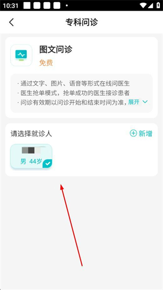 2、在專(zhuān)科問(wèn)診頁(yè)面選擇對(duì)應(yīng)的就診人,進(jìn)入圖文問(wèn)診的對(duì)話(huà)界面。