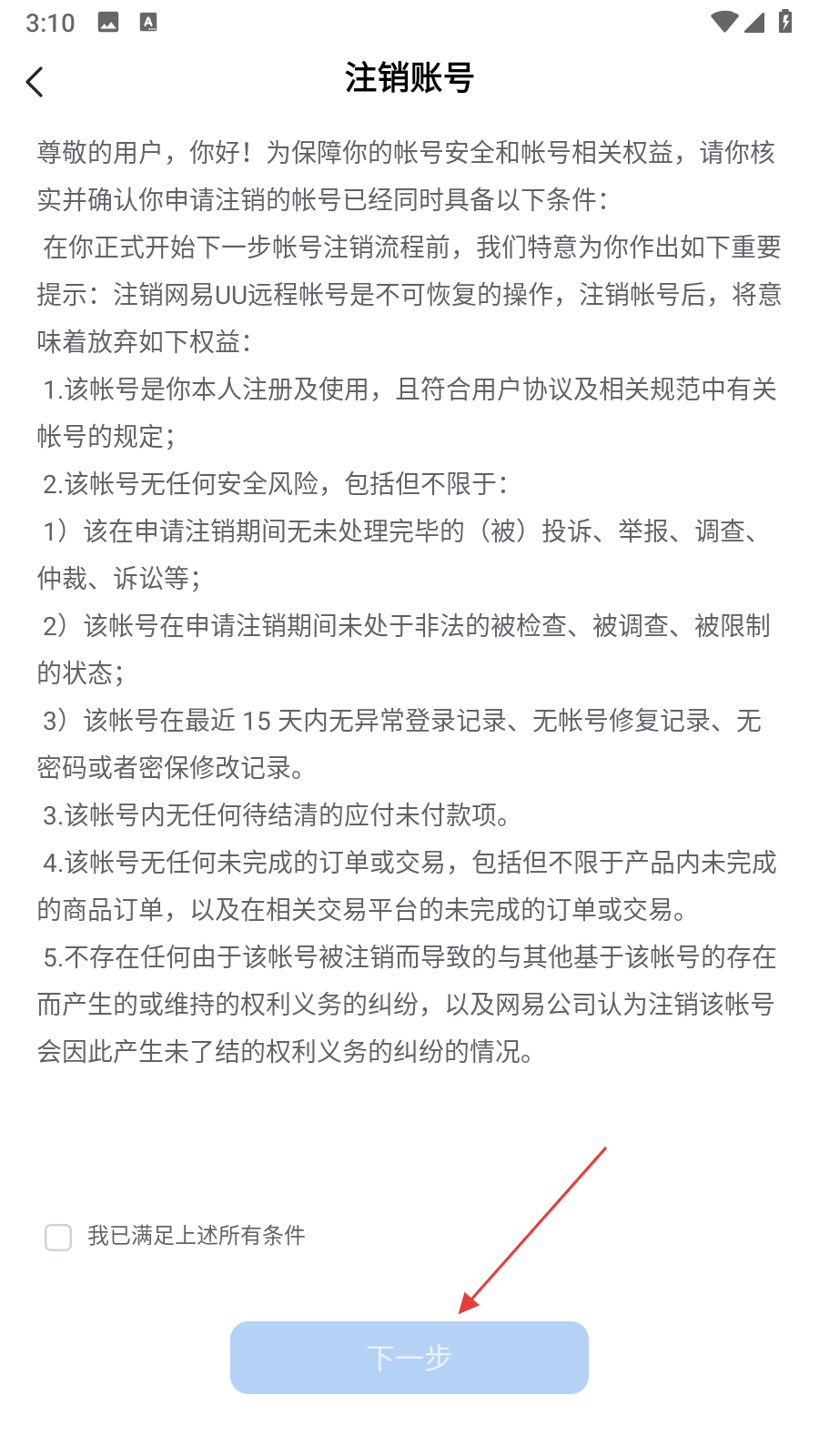 4.、進(jìn)入注銷賬號(hào)頁(yè)面后,仔細(xì)閱讀注銷條件,勾選我已滿足上述所有條件,點(diǎn)擊下一步。