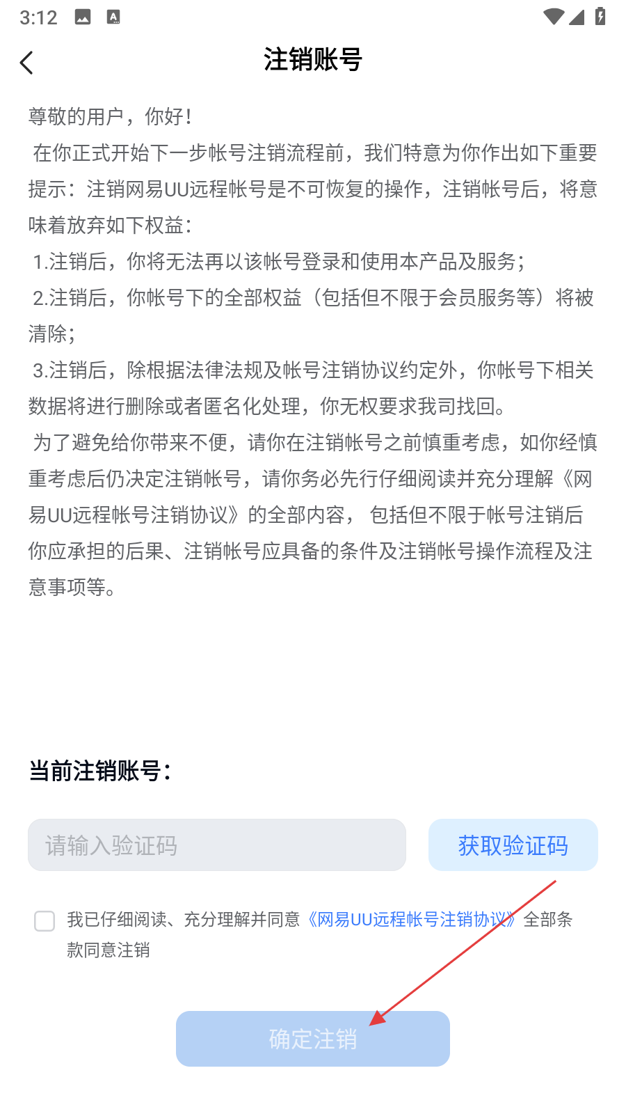 5、后續(xù)在驗(yàn)證界面,點(diǎn)擊獲取驗(yàn)證碼,輸入收到的驗(yàn)證碼,點(diǎn)擊確定注銷。