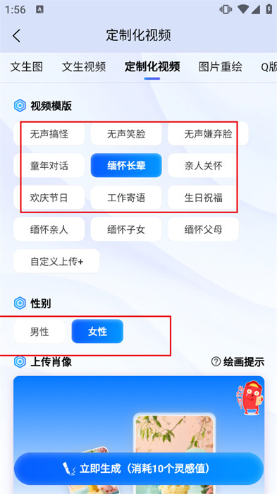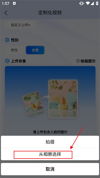 3、接著,你需要設(shè)置一些功能,如畫面風(fēng)格,人物性別等等,可直接導(dǎo)入照片素材;