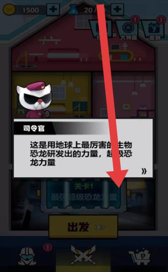 3、在基地界面,指揮官介紹超級恐龍力量,點擊【出發(fā)】按鈕進入關卡,使用恐龍力量相關技能,開啟新的冒險挑戰(zhàn)。