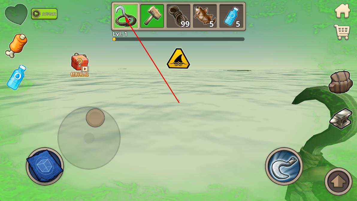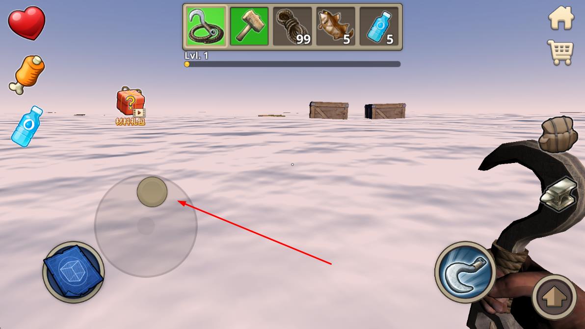 1、游戲伊始,操控角色站在簡陋木筏上,利用鉤子打撈周邊漂浮的木板、木桶,這些都是木筏升級與建造的基礎材料,收集過程中注意把控方向,別錯過關鍵物資。