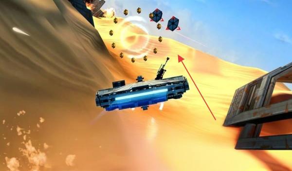 1、太空戰(zhàn)斗關(guān)卡在沙漠場景中,操控飛船按照紅色箭頭方向移動,利用飛船上的武器對空中敵人進(jìn)行射擊,躲避敵人攻擊,完成關(guān)卡目標(biāo)。