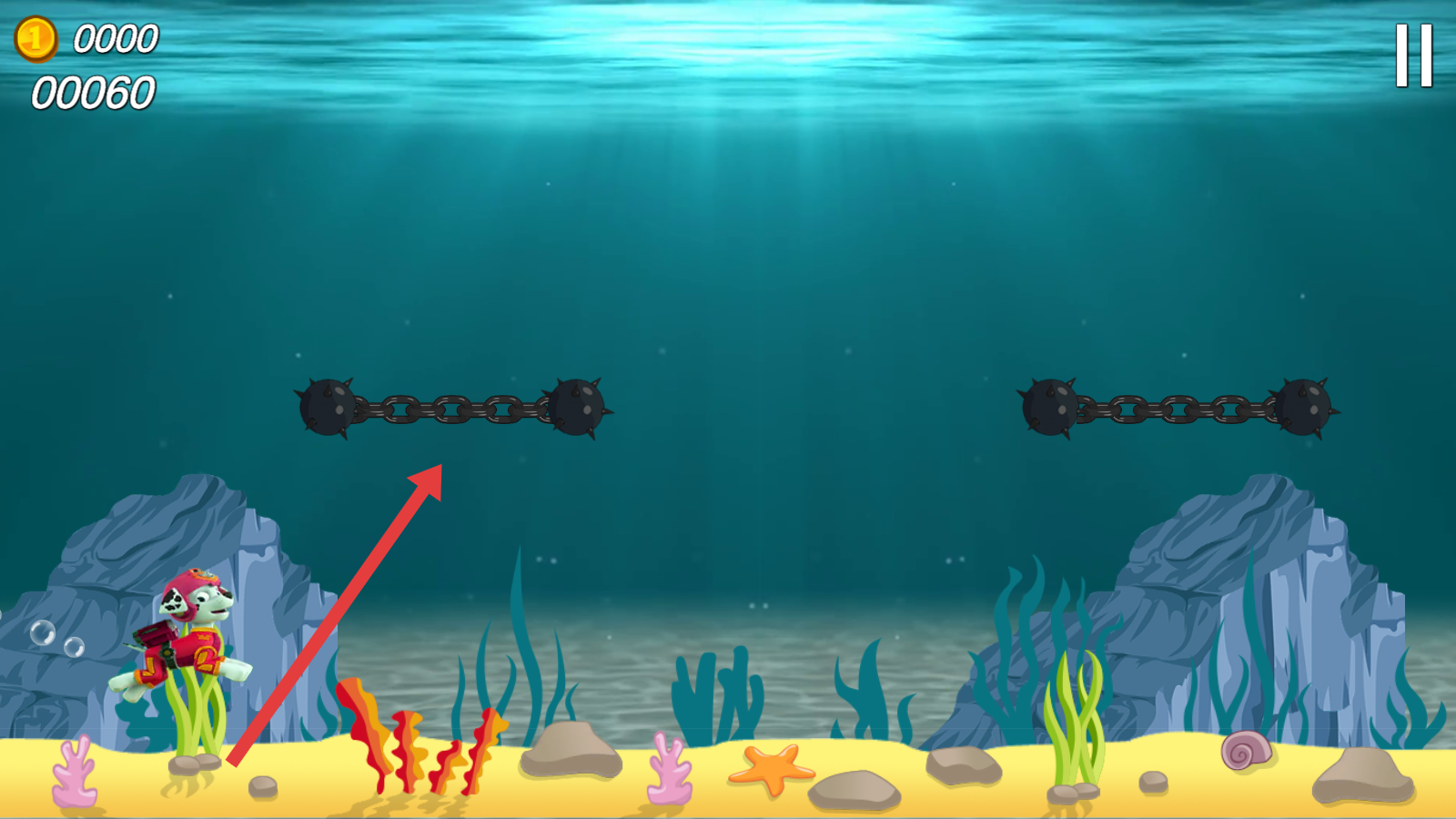 1、游玩開始后,操控角色在海底場景中移動,注意躲避如帶刺鐵鏈等障礙。