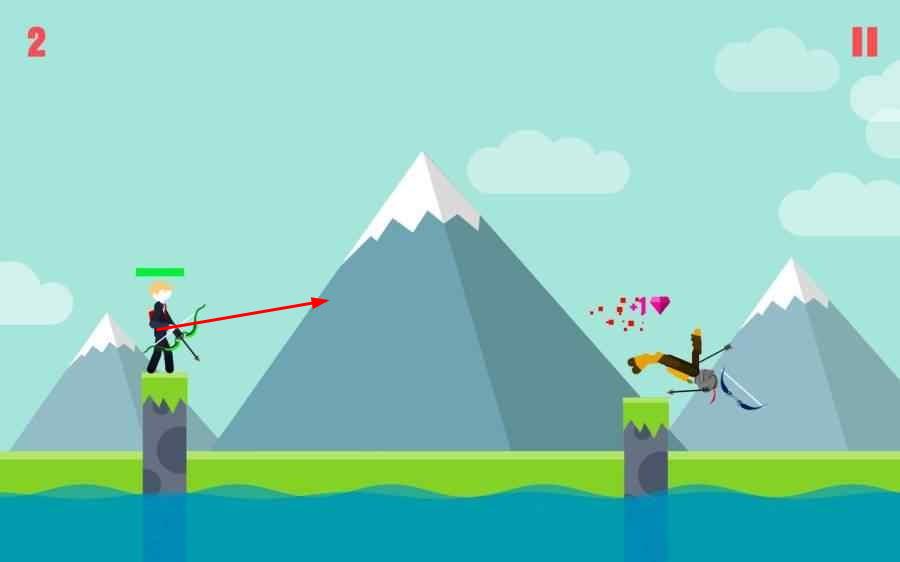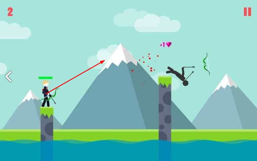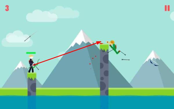 1、進(jìn)入關(guān)卡后,滑動(dòng)屏幕調(diào)整弓箭角度,長按屏幕蓄力控制射擊力度,瞄準(zhǔn)敵方火柴人軀干或頭部,松開手指射出箭矢。