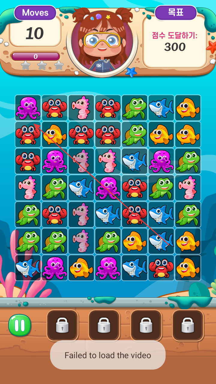 3、在規(guī)定步數(shù)(Moves)內(nèi),達成目標分數(shù)(如Level1需300分),通關解鎖新關卡,體驗更多海洋消除樂趣。