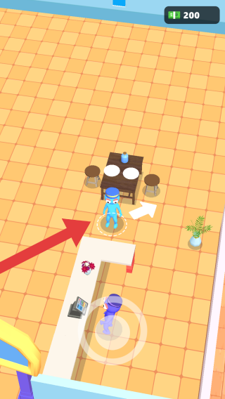 2、玩家操控角色(藍(lán)色人物)在餐廳場景中,執(zhí)行引導(dǎo)箭頭指示的動作(如就座、服務(wù)等),體驗(yàn)餐廳經(jīng)營流程,包括接待顧客、安排座位、提供餐飲服務(wù)等模擬玩法。