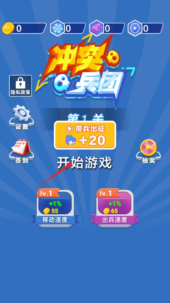 3、成長系統(tǒng):通過完成關卡獲得經(jīng)驗值提升等級,解鎖新士兵與武器,使用金幣購買基礎升級,鉆石可購買高級武器與加速成長,支持觀看廣告免費獲取隨機資源。