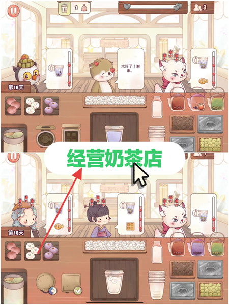 1、進(jìn)入奶茶店場(chǎng)景,為顧客搭配食材,制作飲品,完成訂單,經(jīng)營(yíng)店鋪。
