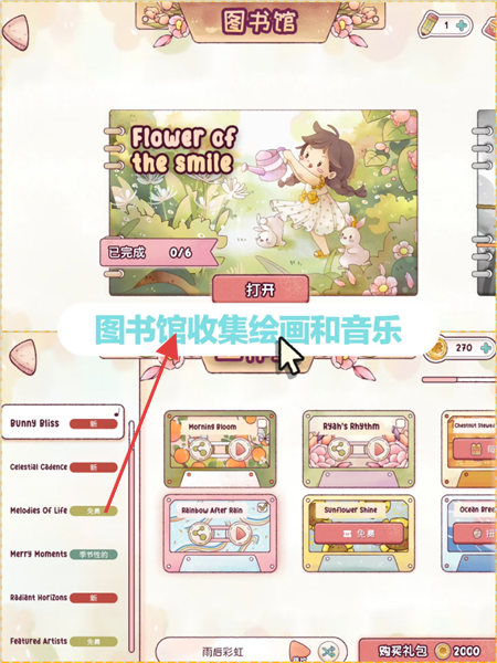 3、打開(kāi)圖書(shū)館界面,收集繪畫作品,解鎖音樂(lè),體驗(yàn)藝術(shù)收集樂(lè)趣。
