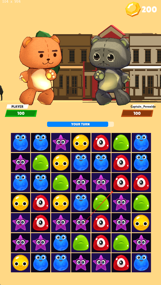 1、進(jìn)入游戲后觀察棋盤布局,點(diǎn)擊三個(gè)及以上同色方塊完成消除,首次消除會(huì)觸發(fā)角色基礎(chǔ)攻擊,對(duì)棋盤下方的怪物造成傷害。