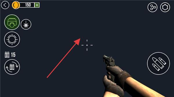 3、射擊場景,操控手槍,瞄準(zhǔn)箭頭指示方向,利用左側(cè)按鍵切換武器、開火,完成射擊任務(wù)。
