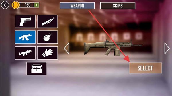 2、武器選擇,在WEAPON欄選突擊步槍,點(diǎn)擊【SELECT】裝備,進(jìn)入戰(zhàn)場,準(zhǔn)備射擊。